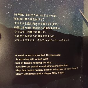 Christmas card from Akihito Ichiro san with Chichibu IPA! It is very nice card to celebrate 10th anniversary of Chichibu. It says following: “A small acorns sprouted 10 years ago is growing into a tree with lots of leaves heading the sky. Just like our passion maturing along the time. May this happy holiday season bring joy to your year! Merry Christmas and a Happy New Year!!”